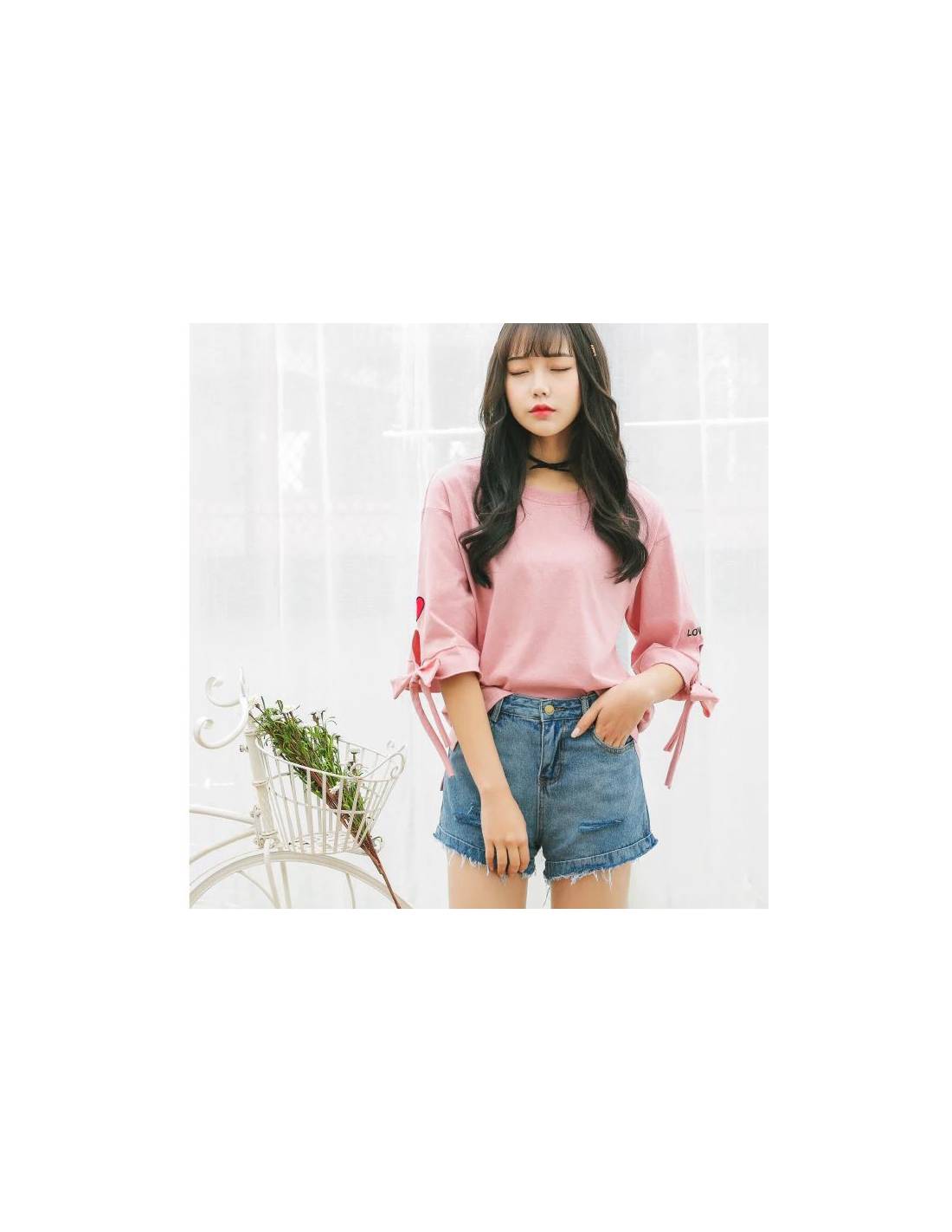 T-shirt à manches mi-longues finis par un noeud. Imprimé petit coeur et love me sur le bout des manches.