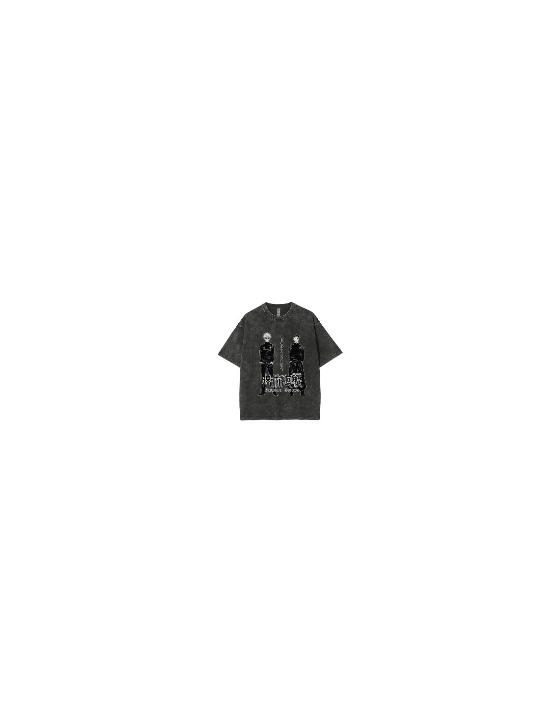 Imprimé en noir et blanc sur un coton au lavage effet vintage, il met en avant les silhouettes iconiques de Satoru Gojō et Suguru Getō, dans leur look de l’époque lycée.