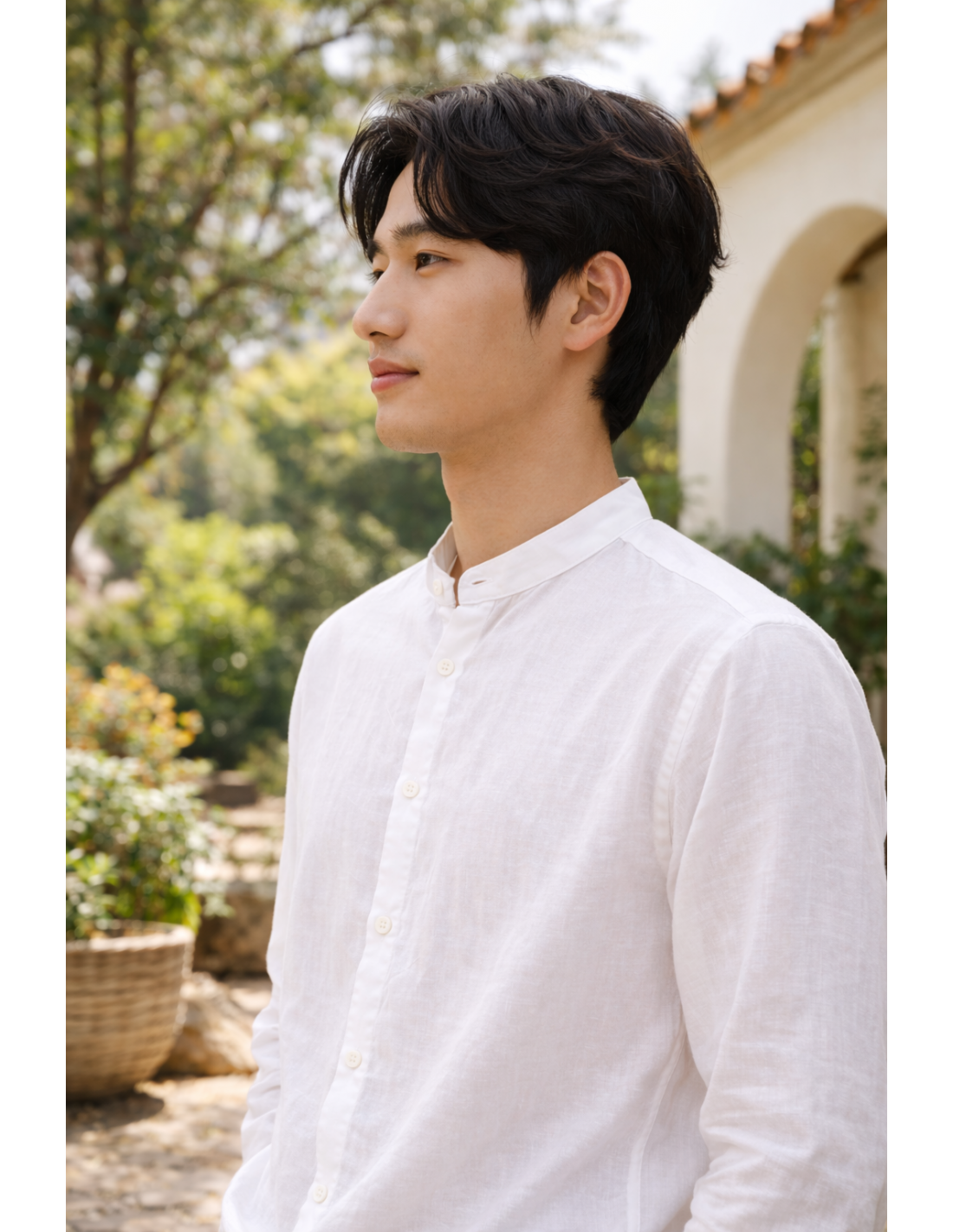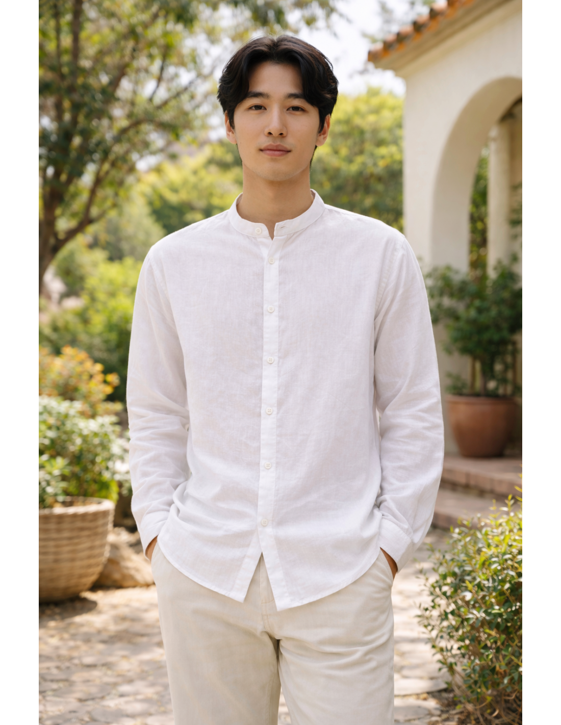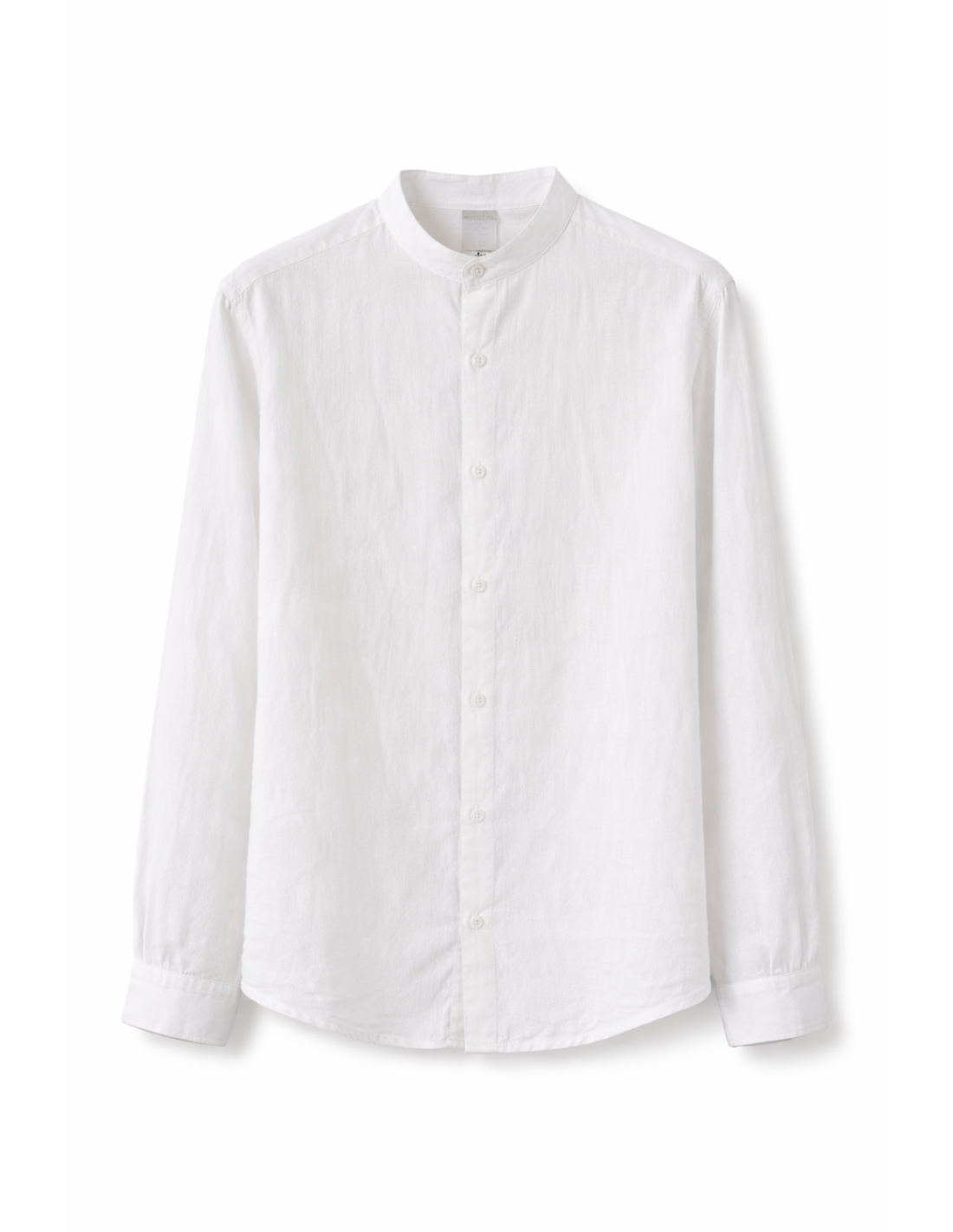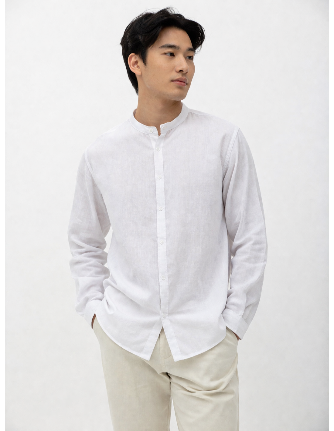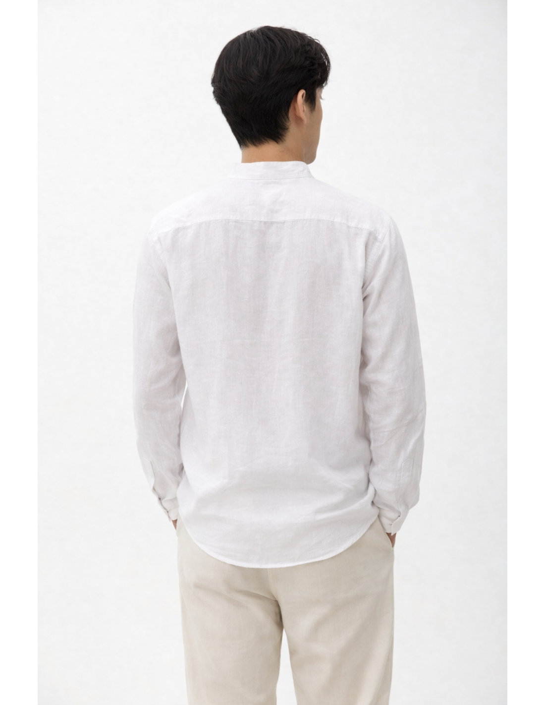 Chemise col Mao en coton et lin, pensé pour un look simple et visuellement fort.